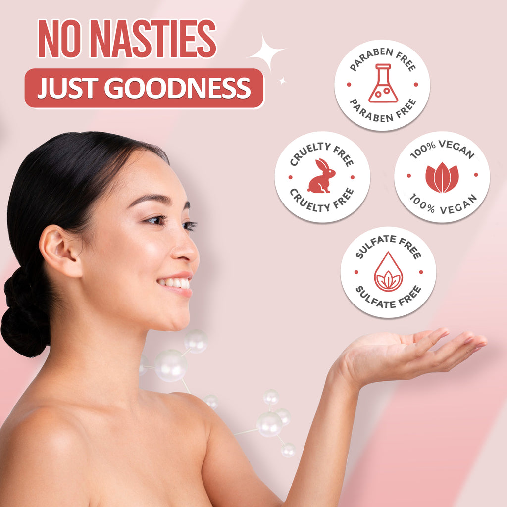 Aqua, Sodium Lauroyl Sarcosinate, Cocamidopropyl betaine, Sodium Cocoyl hethionate, Acrylates Copolymer, Cocamide DEA, Kojic Acid, Vitamin B3 (Niacinamide), PEG-40 hydrogenated castor oil, Alpha-Arbutin, Polyquaternium 10, Perfume, Silicone Quaternium-22 (and) Polyglyceryl-3 Caprate (and) Dipropylene Glycol (and) Cocamidopropyl Betaine, CI 77266, 019140.